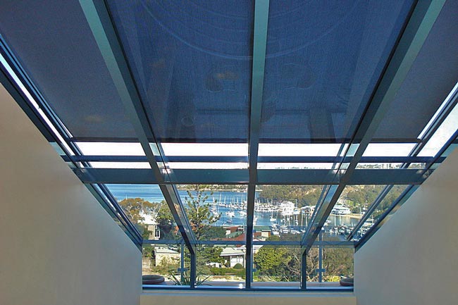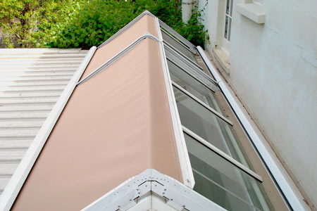 Protecting this glass with a tailor-made Sunmaster FABRIC TENSION SYSTEM (FTS) restores coolness and comfort by keeping out 85-93% of the sun's heat. Fitted externally, our specially developed see-through glass fibre fabric still lets in plenty of light whilst maintaining privacy during daylight hours, keeping the view, whilst blocking out the sun.